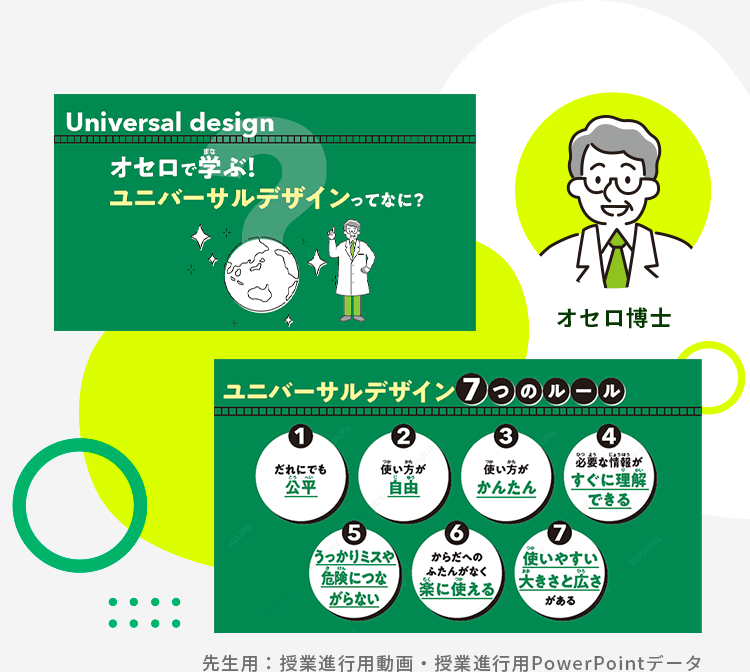 授業を進行するための動画では、オセロ博士がナビゲート。子どもたちにも親しみやすいアニメーションや効果音入りでオセロのルーツやユニバーサルデザインについて解説しています。